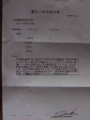 昨年暮れに再度検査をした時はオキナインコの数値で