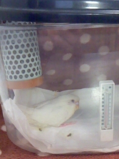 昨日32gあった体重が朝31g、昼には30gになり、挿し餌を試みるが食べず。販売店に電話して今までの様子を聞くと、餌は自分で食べていたので置いておけば食べるとのこと。べったり寝ている件については、よくそうやって寝ていたらしい。とにかく元気がない。保温28度くらい。