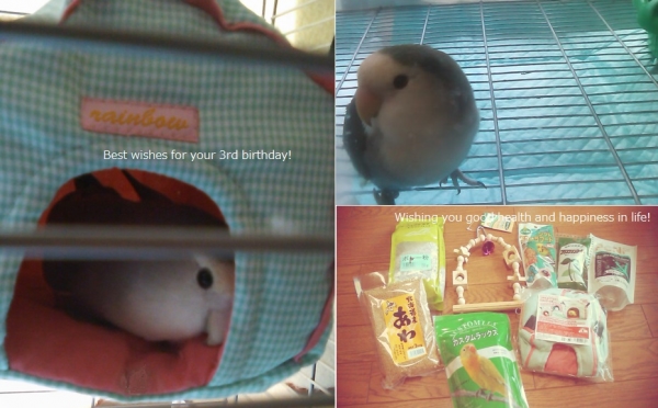 このトピックで良いのか?どうかですが、我が家の1羽飼いのコザクラインコPUCCI。もう可愛くてしょうがなく、思い切り色んな鳥さんグッズや、餌なんかも購入しています。先日、PUCCIのお誕生日にpresentで色違いのバードテントを買い、本人も飼い主もお気に入りなのですが・・夏は少し風も通るタイプが良い様な気がして・・中で風が通らないテントでは夜中眠っている時にむんむんになってしまうかと。you tubeで海外の鳥さんを見るととっても可愛いバードベッドを見かけます(#^.^#)ココナツで出来たものや毛糸で編んでセサミストリートみたいな顔が編んであり口から入るもの)^o^(何処か海外サイトではなくて簡単に購入できる通販はないでしょうか。皆さんの自慢のバードテントを見せてください。良ければ参考にします♪