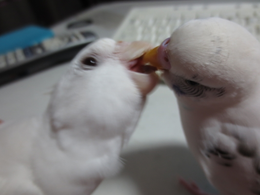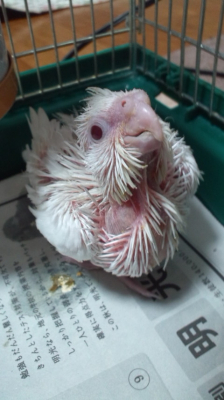 もう1羽は、もっと手強くてペットショップでは食べるけど家では全く食べてくれない…毎回 挿餌の時間のたびに連れていける訳もなく…ルチノーを2回変えて貰い(やっぱり全部の子が食べてくれませ)だったのでまだ毛が生え揃っていないアルビノチャンを3度目の正直でお迎えしました。