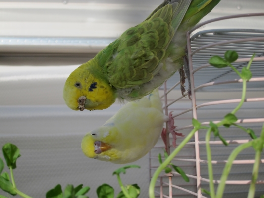 ?クリームイエロー(オス)背中の一部は青いです。よくなつき、オハヨウ、等おしゃべりします。