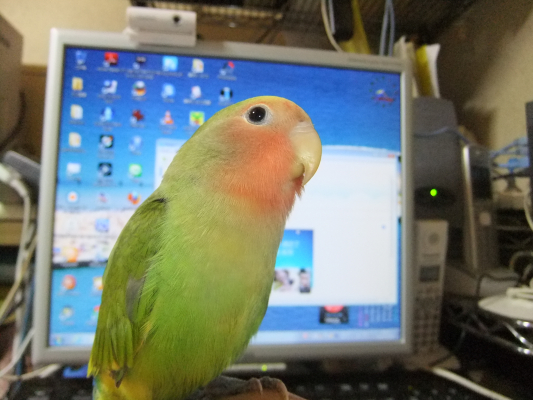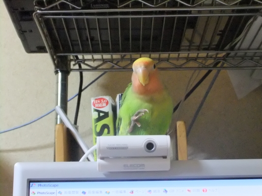 自分で降りれなくなると(羽カットしてあるので)ピィーピィー鳴いて、降ろしてくれーってアピールします(爆)