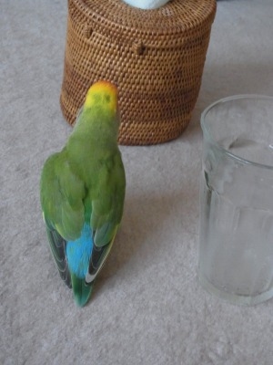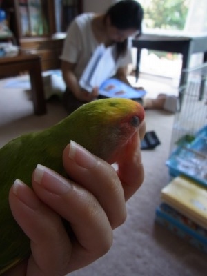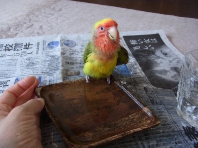 左の翼は骨折したままなので、とにかく翼を傷めないよう、気を遣いながらです。羽ばたく様子を見せる前に手を差し出して運んであげるとか、水浴び道具やエサを持ってきてあげるとか…。