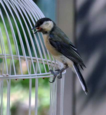 餌籠を屋根の下に吊るして居ます。