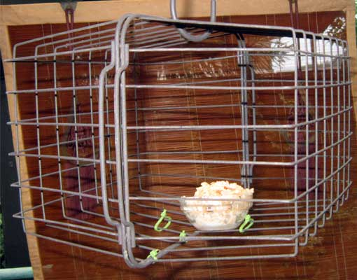 雨中100均カゴのヒヨシェルターで餌を食べるシジュウカラ