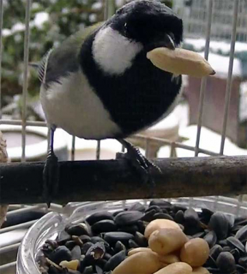 雪の日に餌を求めてやって来るシジュウカラ