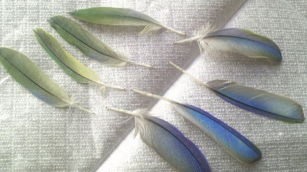最近の換羽で抜けた羽は、今回質問した軸の黒い筆毛と緑〜青色の腹や背中の羽の先が白っぽくなっていること以外は特に異常ありませんでした。