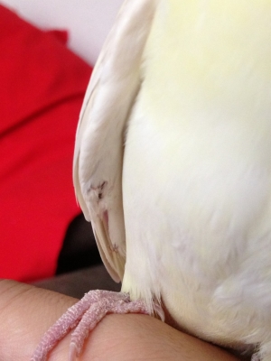今朝、オカメインコ1歳5ヶ月♂の子の右の内側の羽に