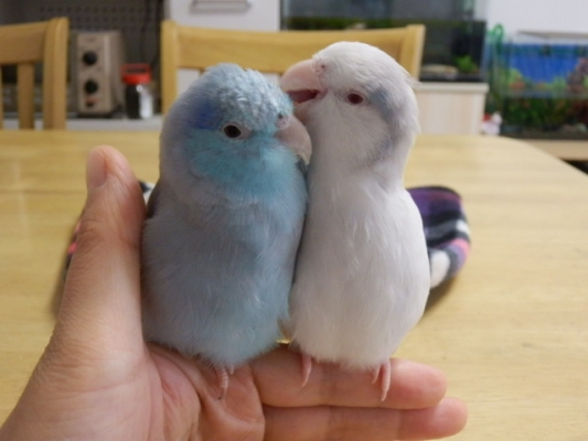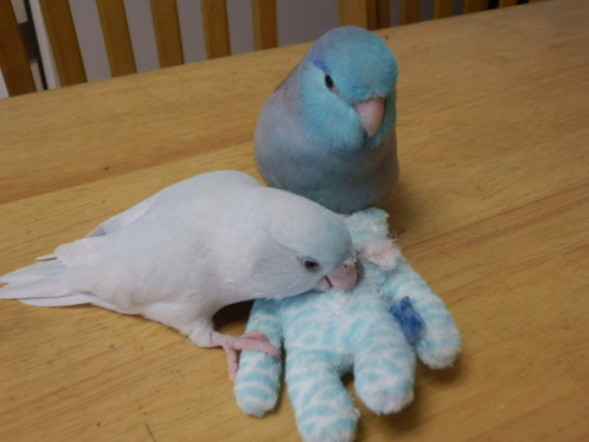 ちなみに2歳ペアのブルーファローパイドはメスですが、鳥の病院でも「顔は男の子だね〜〜」と言われました(笑)♂♀は肩の羽の色で見分けるのが一番よさそうですね。