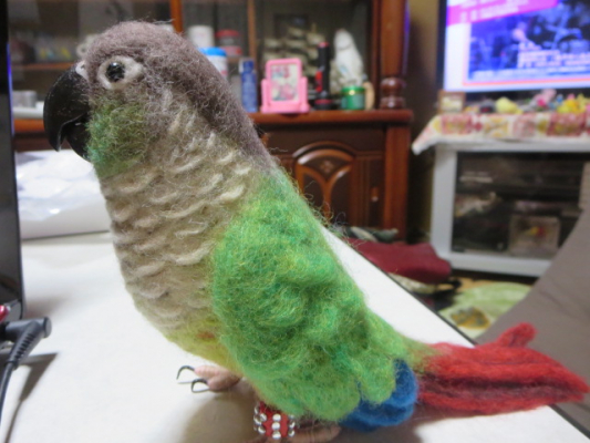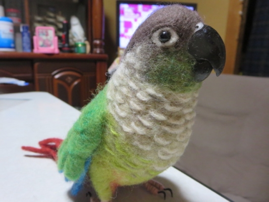 ヤフオクにてお嫁入りした人気のクリエイターさんが作られた私が是非に飼いたい子である”ホオミドリアカオウウロコインコ”の羊毛フェルトの子です。とてもリアリティに