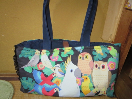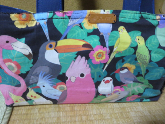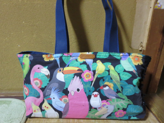 今年もよろしくお願いしまス。ピヨコらぶです。ネット通販でとてもかわいいインコちゃんいっぱいの生地を見つけたので購入して自分用のトートバッグを作りました