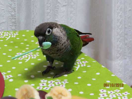 先日、ホオミドリアカオウロコインコ(ブルー)5ヶ月の仔をお迎えしました。