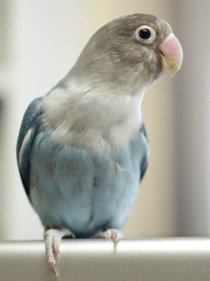 ブルーボタンインコ・体長12cmくらいで、顔はグレー・胸は白・体はブルー・くちばしはピンクです。
