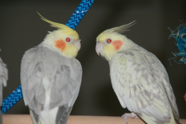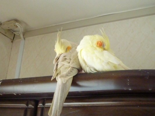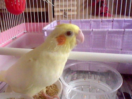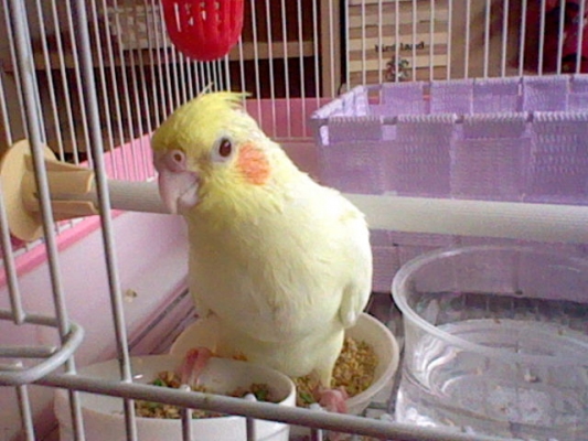 うちの子はもん&るびーさんの多分「ルチノー」であろうオカメインコさんと違い、「ルチノーパール」のメスですので、羽の色は、白地に黄色いので、全体に黄色く見えます。