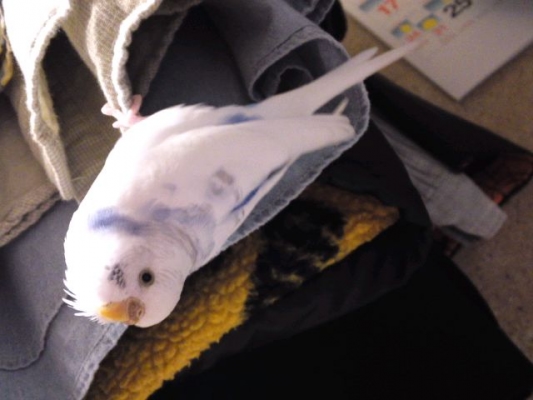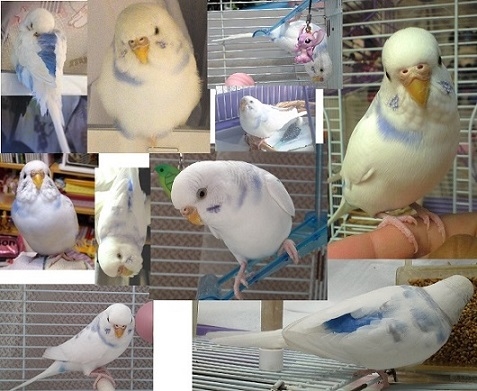 2歳のメスで、全身:白、首元左右にブルー、首の後ろにブルーとグレーのまだら、腰:ブルー(羽を広げると出てきます。)