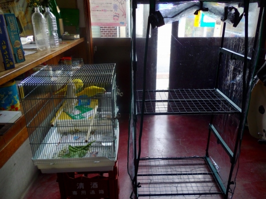 ケージはホーエイの465です。ホームセンターとネットで鑑賞用の花に使う簡易ビニールハウスを利用しています。