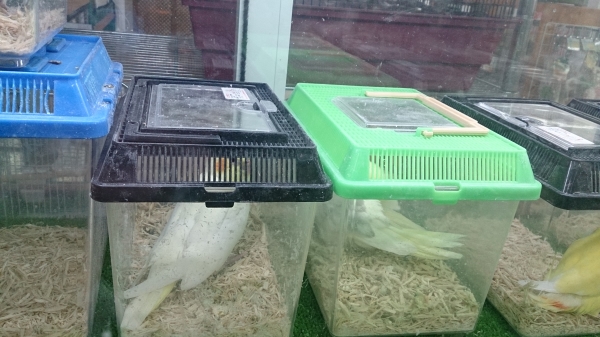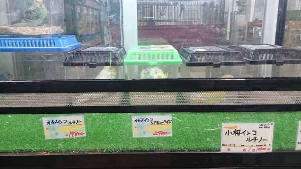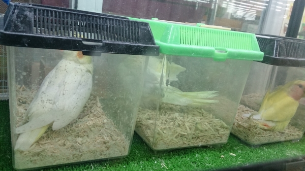 小動物コーナーにて、コザクラインコ、オカメインコ、セキセイインコが小さな虫取り用カゴ?に入れられて展示されてました。