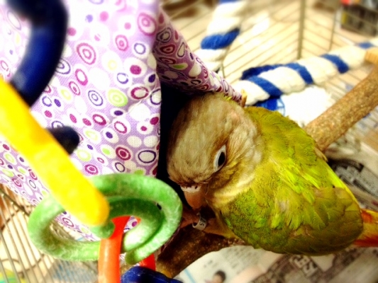 さっそくケージに取り付けるとすごい勢いで中に入って収まってました。頭隠して尻隠さず…少し小さめのバードテントがちょうどいいみたいです。ウロコインコは…(by母