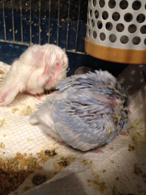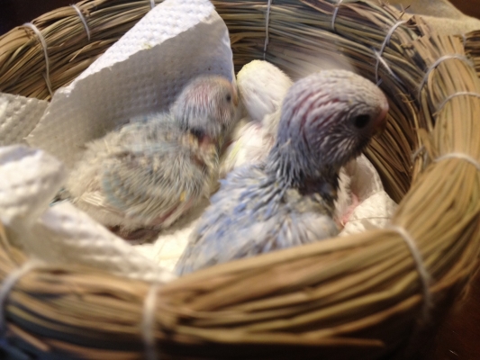 雛の色がだんだん見えてきました。 父鳥は黒目で真っ白、 母鳥はブルーイエローフェイススパングルなのですが、 今回は黒目のクリームと ブルー系のオパーリンが二羽のようです。 オパーリンですが、模様はごく薄いグレーのようです。 遺伝って不思議ですね。