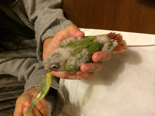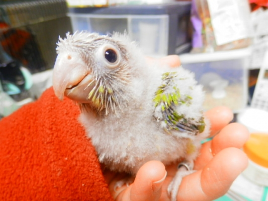 こんばんは。今日ホオミドリアカオのシナモン雛をお迎えしました。店で一目見て購入を決めました。可愛さにやられました、完全にノックアウトです(笑)