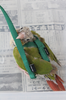 ホオミドリアカオウロコインコ(シナモン)挿し餌雛、ハーネス装着練習2日目です。ハーネスやフライトスーツで外に散歩へ行った時の写真をお持ちの方、見たいです!