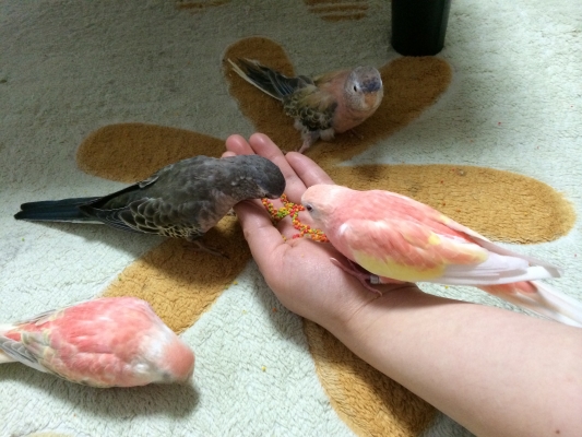ピンクの羽の鳥さんって、あまり見かけない印象です (*´ω`*) 撫子ちゃん…♪ ピッタリの日本女性らしい、お名前ですね♪撫子ちゃん達を見てると優しい気持ちに、なれそうです…★