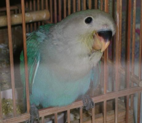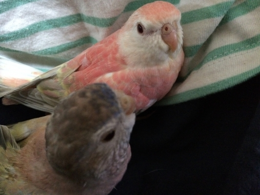 ボケボケ写真ですが、主人にねんごろにされているコボウシインコ。