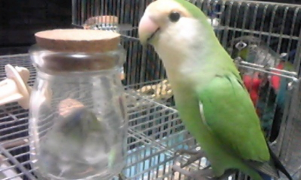 このインコちゃんはなぜ餌入れに入ってみようと思ったんでしょう?狭くて落ち着くのかな?