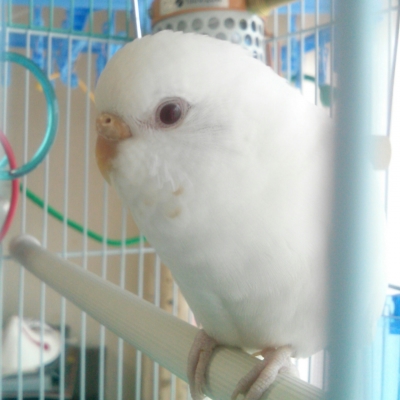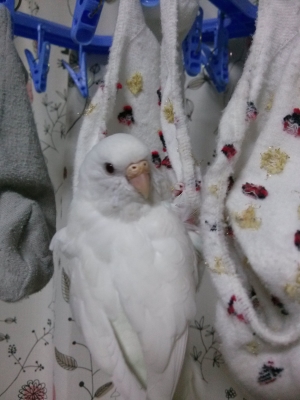 性格:おしゃべり好きで、「ラミちゃん」「ラミー」「おはよっ」と喋ります。他にも鳥語でぺちゃくちゃとよく喋る子です。手乗りで人慣れしており、トイレットペーパーの芯や洗濯物等の狭い所に潜るのが大好きです。