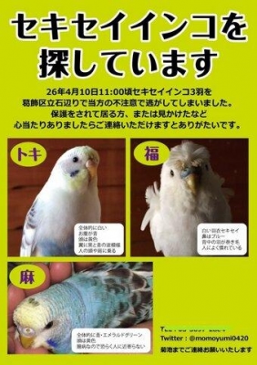 東京都葛飾区立石にて2014年4月10日午前中に網戸が急に外れ三羽のセキセイインコを迷子にしてしまいました。