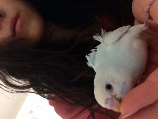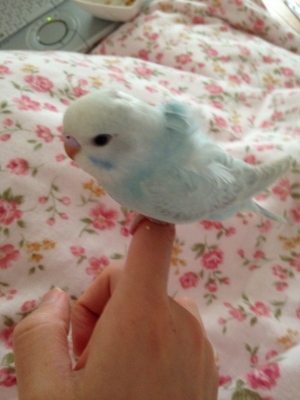 品種は一応羽衣セキセイインコですが、あまり羽のめくれは少なく、普通のセキセイインコと羽衣セキセイインコの中間ぐらいの感じです。