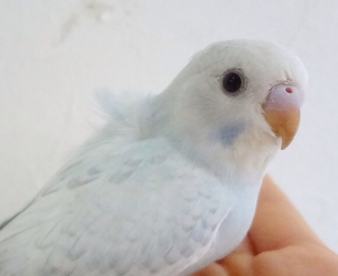 頭などは白く、お腹と羽が水色です。全体的に白っぽい見た目です。頭のてっぺんがちょっとだけハゲてます。