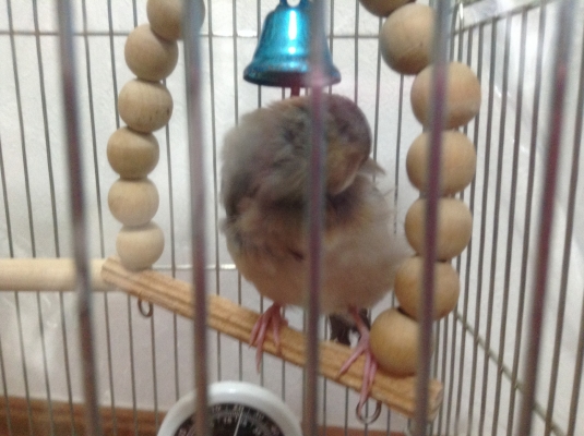 狭いプラケースで羽ばたきの練習も始めたので、今はケージにお引越ししてます。