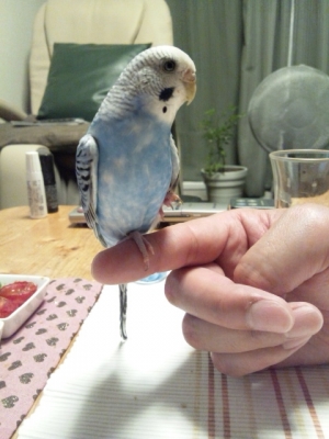 手乗りでよく人に慣れています。名前を呼ぶと「ピッ」とお返事をします。おしゃべりはしません。 オーツ麦が大好きで、「おやつ」という言葉に反応します。人の肩によく乗ります。