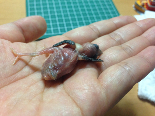 初めての繁殖で、1羽だけかえった子ですが、親が世話をしていない様に見えたため、3日目から私が育てています。