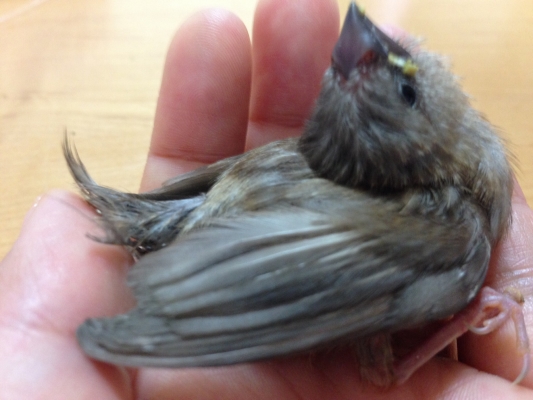 立つこともできず、目を閉じて、じっとしていました。口を開けてくれないので、無理やり開けて、少しずつ挿し餌していました。