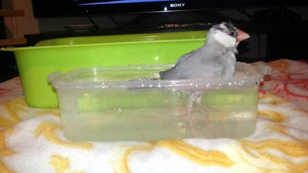 羽を精一杯広げて、びびりながらもお水がたまったら