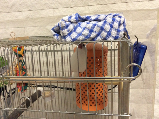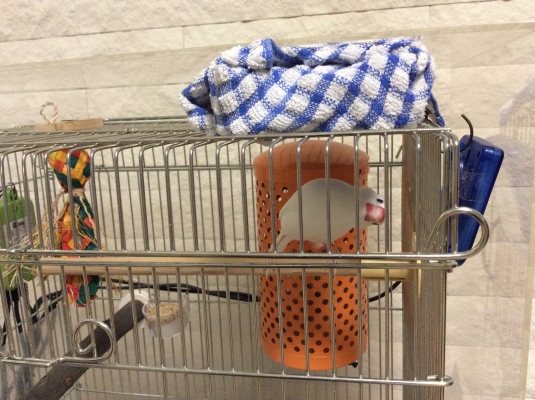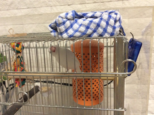 今は放鳥時 毎日新聞紙広げてタッパーに水を張り