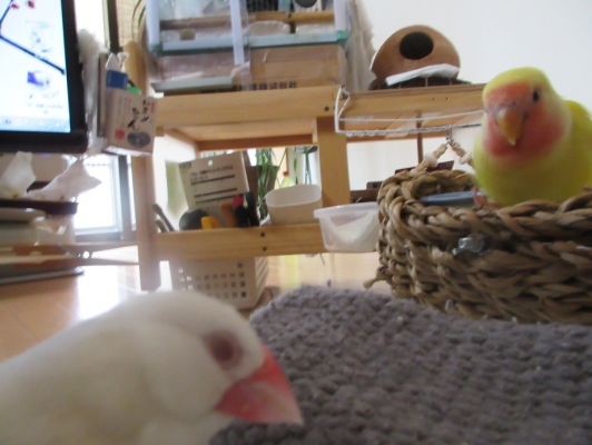 サチが皿巣に入れていたティッシュを落として遊んでいると、チッチが覗いて私もそれ欲しいと言わんばかりに首をかしげて見ている姿も超面白い(#^^#)