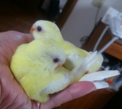 雄。。。。ルビー君♪ 巣あげした雛達♪写真は下向きです(*_*) 一人餌になり手のひらでピーヨピヨ♪