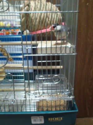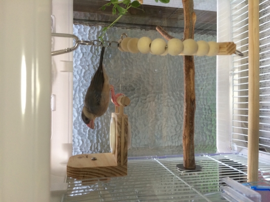 ケージには止り木を2本と菜さし、スカイレストランを設置していて、指に乗せた状態で止り木やスカイレストランに移すと乗るにはのるんです。