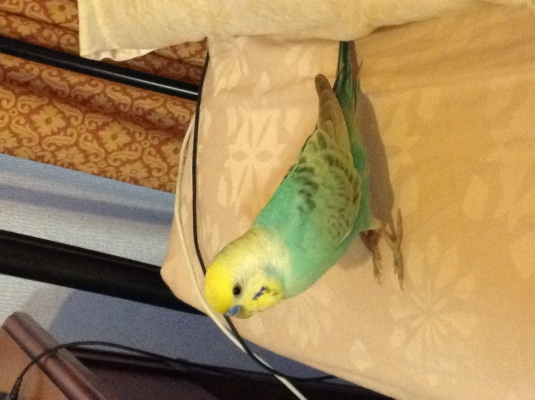 頭は黄色、体は青緑色。羽には灰色の模様があります。とても人懐こく、肩や頭に乗りますが、手にはあまり乗りたがりません。とても元気です。ピーちゃん、ピーちゃんと喋ります。