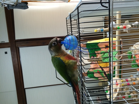 ケージにもいろんなオモチャがぶら下がっていますね。