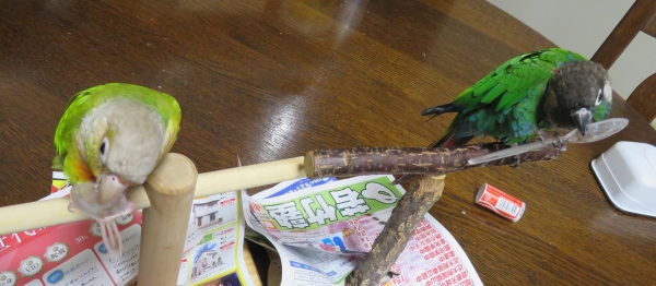 最近ウロコの2羽がテントを使わなくなり、新聞で寝ているんです