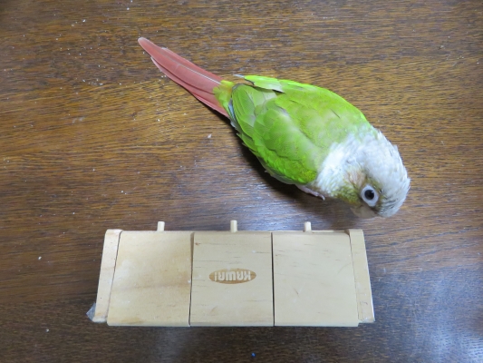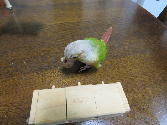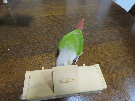 ケージに入れたり、開けて見せたんですがなかなか興味を示さなかったんですけど、クッキーがおやつをゲットするところを見せたら、成功したんですよー(*^^)v