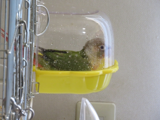 リリィちゃん、水浴びをちゃんと容器の中でするんですねぇ〜(@@)