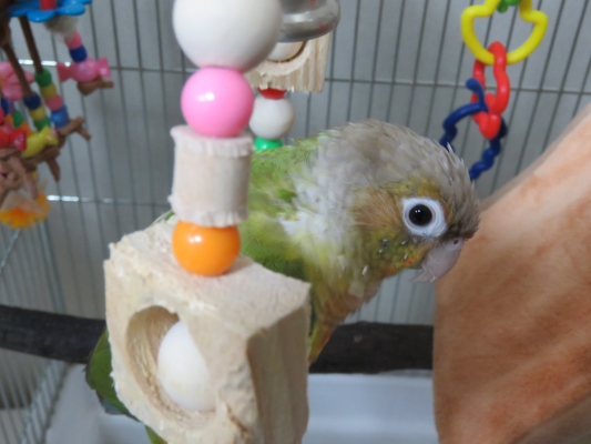 今日も朝から一日中放鳥していたのですが、ぴ~ちゃんがピッピッピッ〔助けて~〕って鳴くのでどうしたのかと慌てて見てみるとS字フックに頭を入れて外れなかったので慌てたみたいです(笑)直ぐに抜けるのに慌て者のぴ~ちゃんです(^ー^)