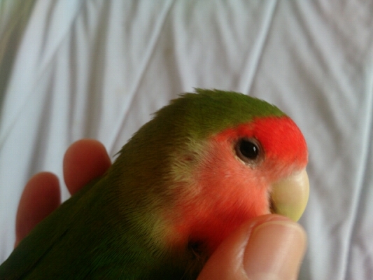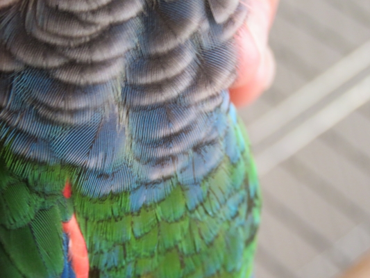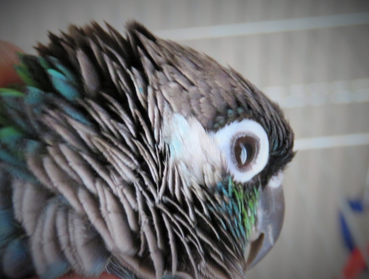 今朝、3羽の体重を測って、クーちゃんをよく見ると、ほっぺの所の羽に綺麗な水色が挿し色みたいに入っていました