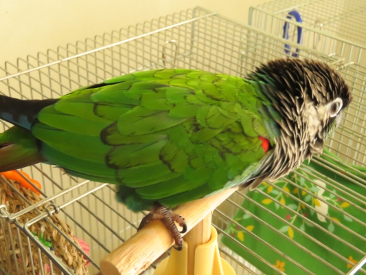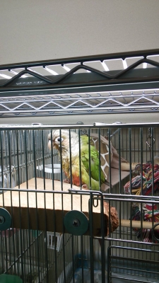 先週から羽の抜けが多くなってきました。と同時に生えかけの羽もちらほら。殻に覆われて真っ直ぐな状態ですが、よ〜く見ると紛れもなく緑の羽でした。おもちゃはまだ怖がって近づかない状態です・・・・