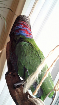 アカビタイムジオウムだったかな、片方の羽を広げてその羽に顔を付けて